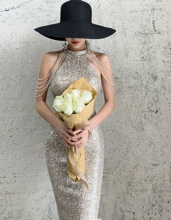 > 雪宝莲2020新款修身鱼尾挂脖性感肩流苏晚礼服